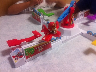 髭の飛行機のりがクルクル回って、にわとりのコインを狙ってくる。3つのコインをあてられると負けである。
